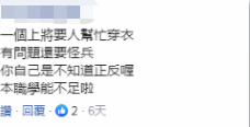 然而岛内网友对此说法并不买账,有人批评台军,不能一出事就把责任推给小兵。“一个上将要别人帮穿衣,有问题还要怪兵”。
