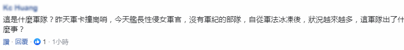 对这种情况,有岛内网友讽刺“这是什么军队”,“中时电子报”还形容称,涉不正当男女关系的军纪事件频频发生,已令台军“元气大伤”。