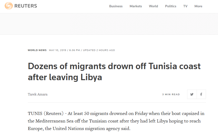 【环球网报道 记者 赵建东】“这是今年最严重的非法移民沉船海难之一。”路透社援引联合国移民组织(IOM)消息称,当地时间10日,一艘从利比亚出发前往欧洲的船只,在突尼斯海域外的地中海发生倾覆事故,至少有50人死亡,16人被救起。