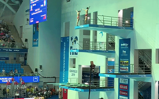 当地时间13日下午,在韩国光州南部大学游泳馆进行的2019游泳世锦赛男女混合双人10米跳台的比赛中,中国选手司雅杰、练俊杰力克其余参赛选手,夺得冠军,成就本届游泳世锦赛中国代表团首金。(央视记者 唐鑫)
