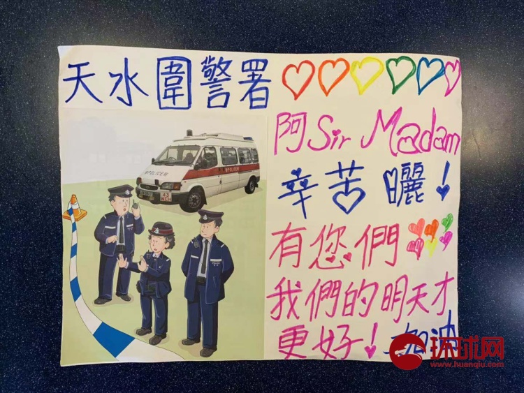 环球时报-环球网记者在现场看到,天水围警署附近的居民接二连三地到天水围警署慰问,有的家长带着小朋友前来并送上自制的卡片、画作,并和警察合影。