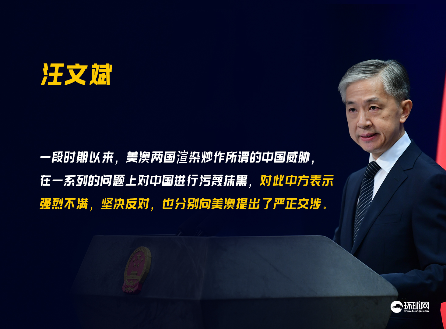 【环球时报-环球网报道 记者 张卉】澳美日前双部长会期间发表联合声明,在涉及香港、新疆、南海等问题上对中国无端指责和攻击。对此,中国外交部发言人汪文斌在29日的例行记者会上表示,中方注意到美澳举行的外长和防长的”2+2”磋商。一段时期以来,美澳两国渲染炒作所谓的中国威胁,在一系列的问题上对中国进行污蔑抹黑,对此中方表示强烈不满,坚决反对,也分别向美澳提出了严正交涉。