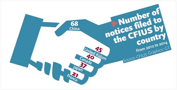 据CFIUS年报统计,2007—2014年CFIUS对中国企业并购审查由3件激增至24件,年均增长率87.5%。2013—2015年共审查39个经济体的387起交易,被审查中国企业投资数量为74起,分别占到当年审查总量的21.7%、16.3%和20.3%,年均19.4%,审查比重连续三年位居第一。