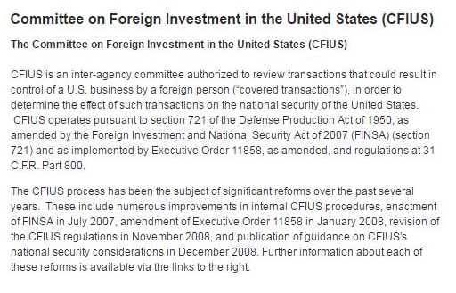 2007年,美国国会通过了《外国投资与国家安全法》(Foreign Investment and National Security Act of 2007),进一步修正《埃克森-佛罗里奥修正案》确定的外国投资审查机制,进一步强化了CFIUS对外国投资和并购活动的审查权力。