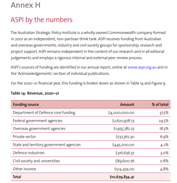 前不久,不断在澳大利亚政坛和民间疯狂煽动反华情绪、更在海外舆论场拼命抹黑中国和中国人的形象、搅动排华情绪的澳大利亚智库——澳大利亚战略政策研究所(ASPI),公布了该机构2020-2021年度的“年报”。