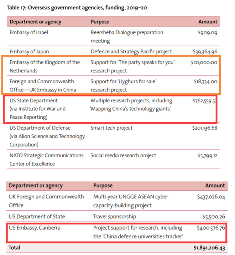 另外,英国政府(英国驻中国大使馆)和荷兰政府(荷兰大使馆)也在该年度给ASPI提供了两笔用来妖魔化中国的经费,一笔针对新疆,一笔针对中国的“统战”系统。