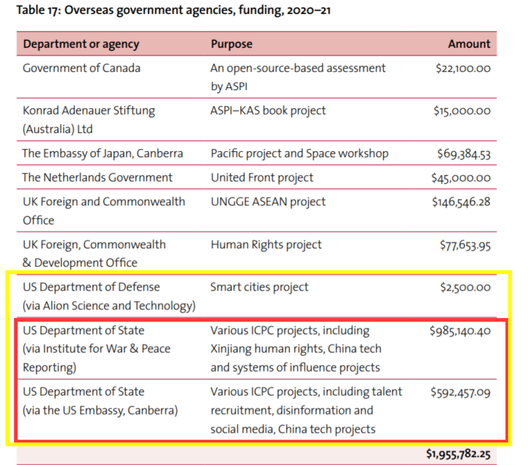 不过,ASPI的年报中真正抓眼的,是其披露的海外政府经费部分。因为美国国务院不仅是这块经费中最大的来源,而且美国政府给ASPI的经费,绝大多数是用来抹黑中国的。