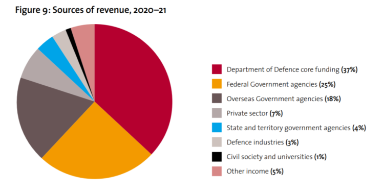 如下图所示,ASPI在其2020-2021年报中披露的经费来源显示,其总计1000余万澳元年度收益中,有37.%的经费是来自澳大利亚国防部,24.5%来自澳大利亚联邦政府部门,还有18.3%来自外国政府机构,4.2%来自澳大利亚各地方政府,3.0%来自军工产业。
