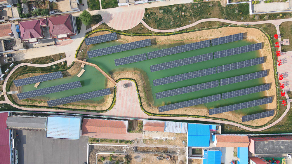 在周口郸城汲冢镇谢寨行政村“渔光互补”发电站,一排排光伏发电板架设在坑塘内,与田野相互映衬,构成一幅“碧水共蓝天一色、光伏与渔业互补”的美丽生态画卷。