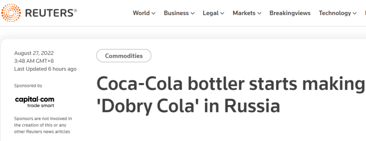 【环球网快讯】俄乌冲突爆发后,可口可乐公司等多个西方品牌已撤出俄罗斯市场。据路透社26日报道,瓶装商可口可乐HBC AG公司已开始在俄罗斯生产一种本土可乐,名为“Dobry Cola”。可口可乐HBC公司在一份声明中称,“Dobry Cola”与可口可乐公司无任何关系。
