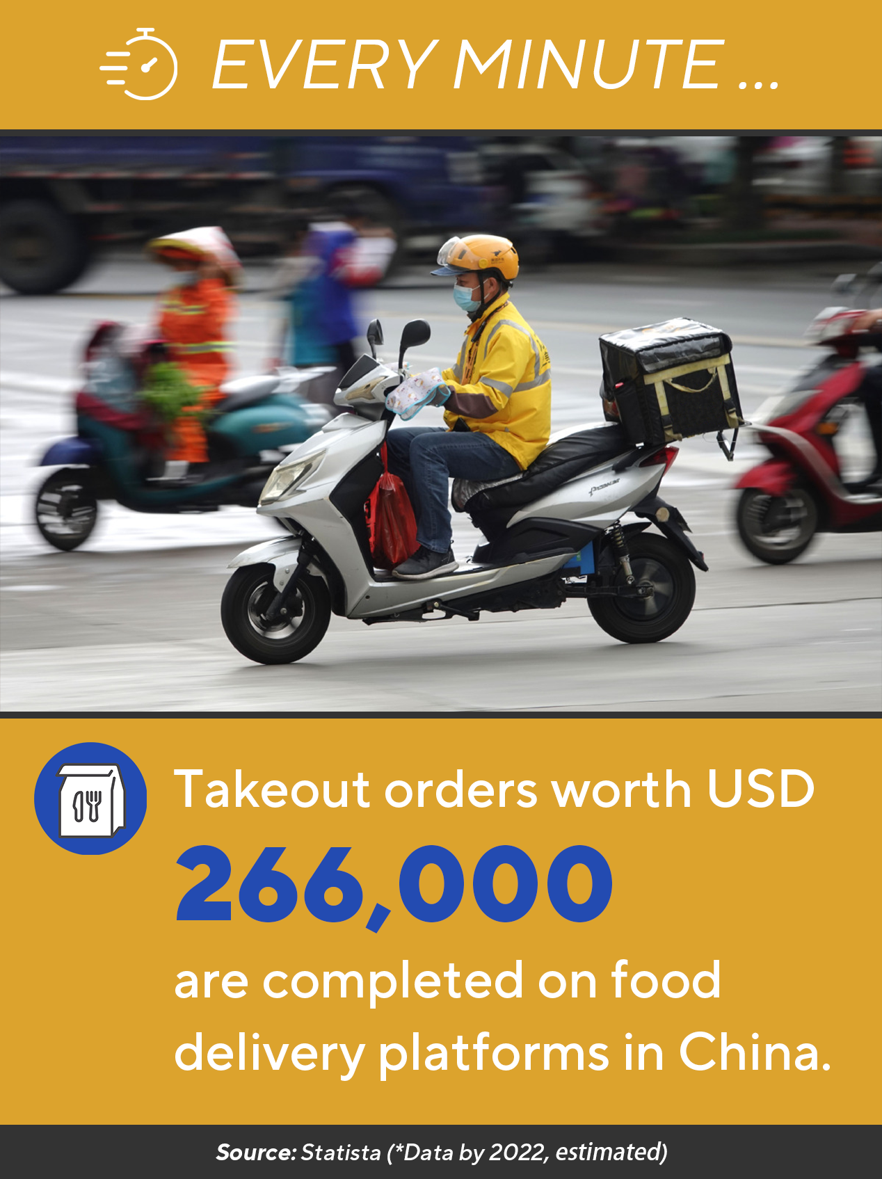 9. 每一分钟:中国的外卖平台完成价值26.6万美元的外卖订单