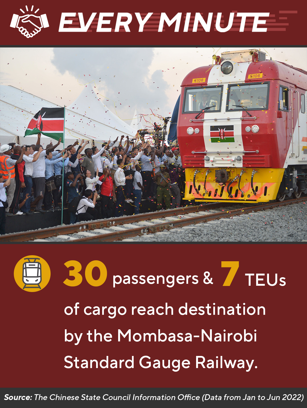 2. 每一分钟:30名旅客和7标箱货物通过蒙巴萨-内罗毕标轨铁路(蒙内铁路)到达目的地