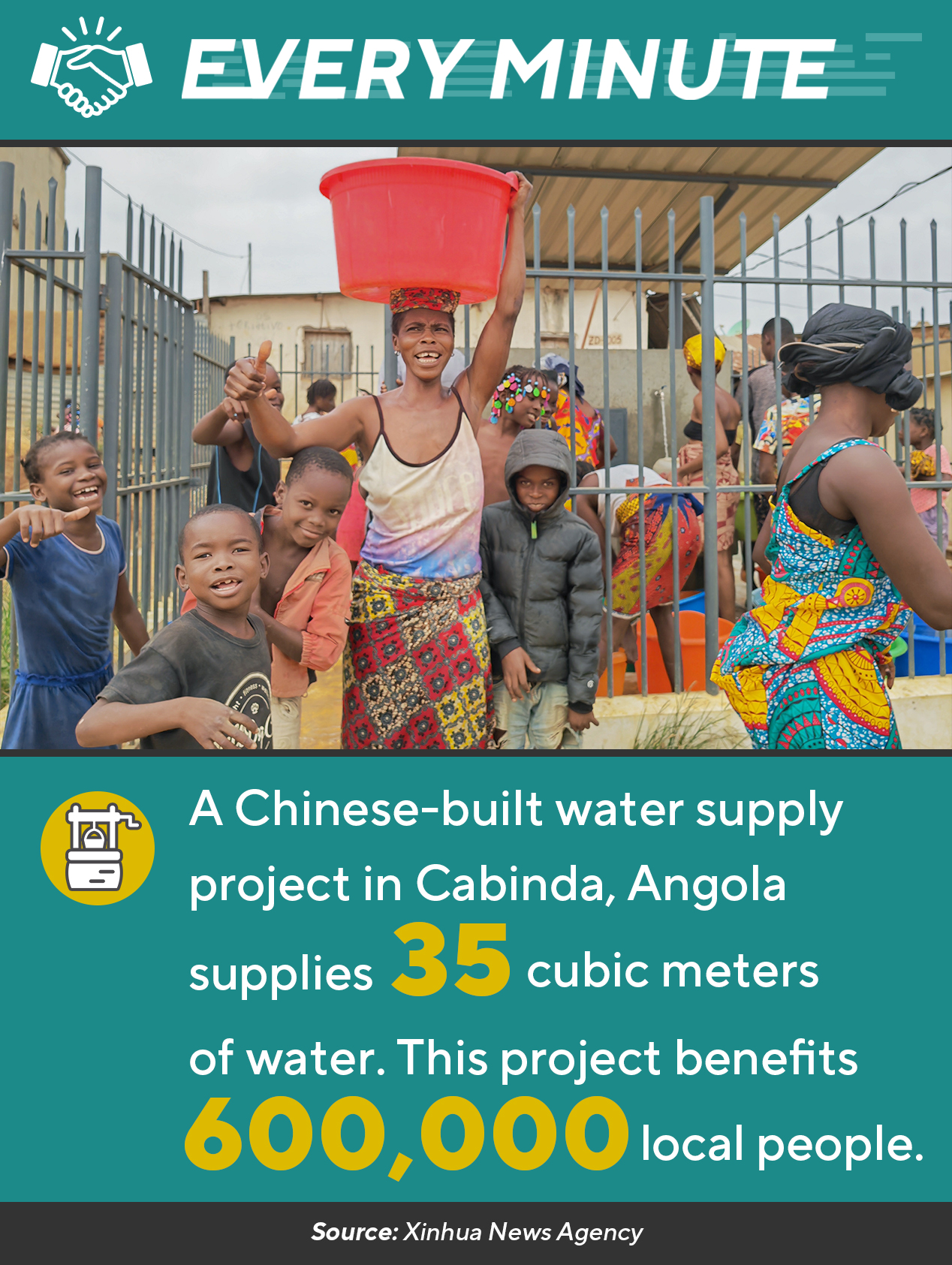 5. 每一分钟:中国企业在安哥拉卡宾达省援建的供水项目提供35立方米的水。该项目使60万当地民众受益