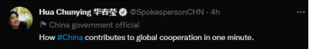 大约一小时后,华春莹又连续发布了另外10张图片,均是关于中国在中外合作交流上取得的辉煌成就,有中企项目为当地发展贡献巨大力量、有经贸合作为全球造福。她在该组图片中的第一张上方配文写道:“中国如何在一分钟内为全球合作做出贡献?”↓