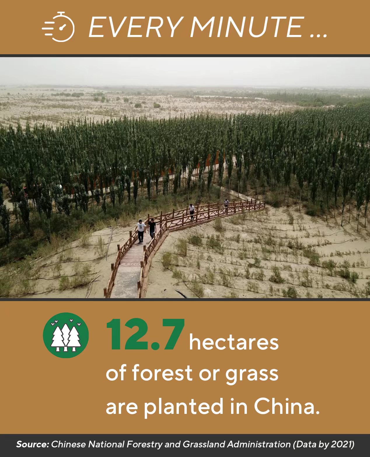 2. 每一分钟:中国新增12.7公顷的森林或草地面积