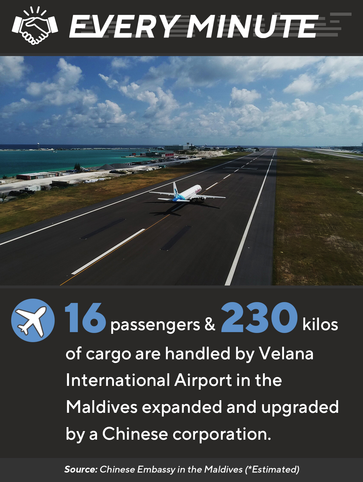 4. 每一分钟:16名旅客和230千克的货物在由中国企业扩建升级的马尔代夫维拉纳国际机场得到安排和运送