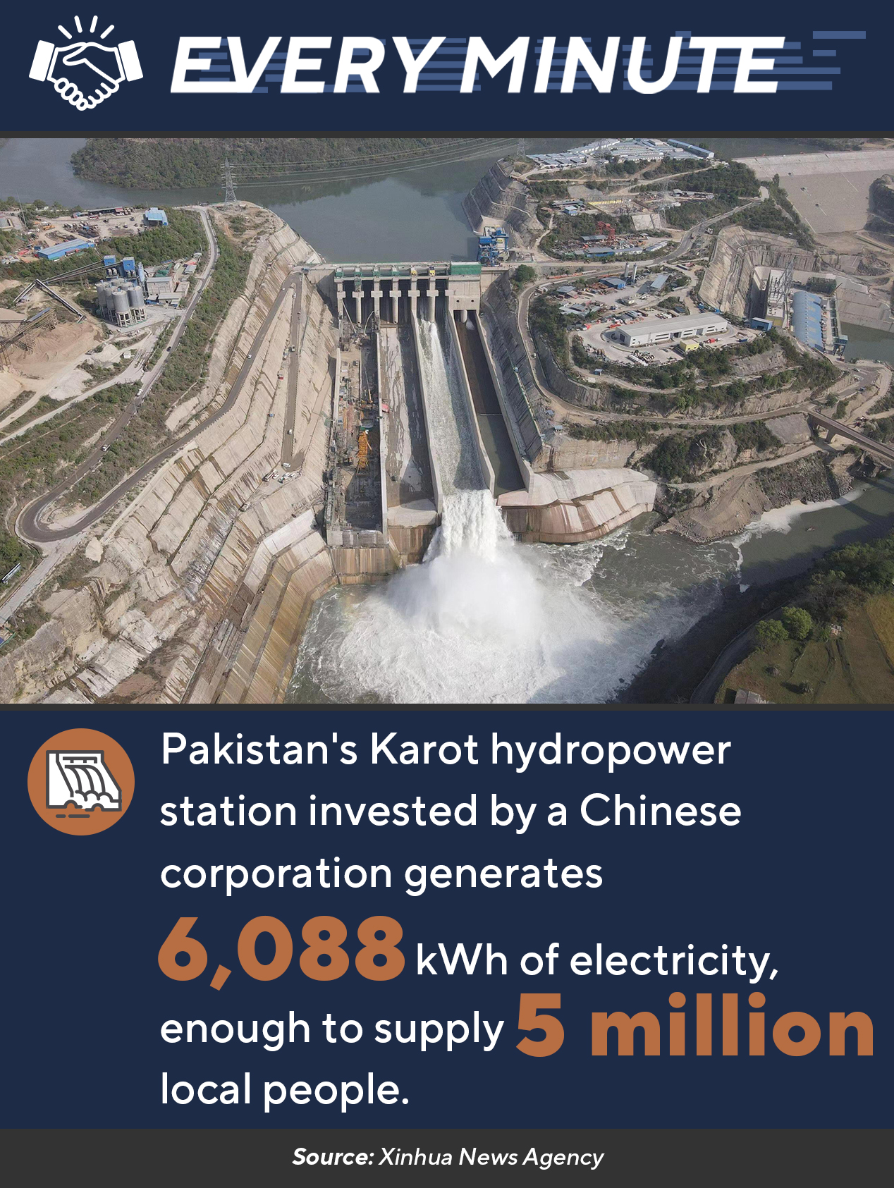 3. 每一分钟:中国企业投资援建的巴基斯坦卡洛特水电站发电量为6088千瓦时,足以满足当地500万人的用电需求