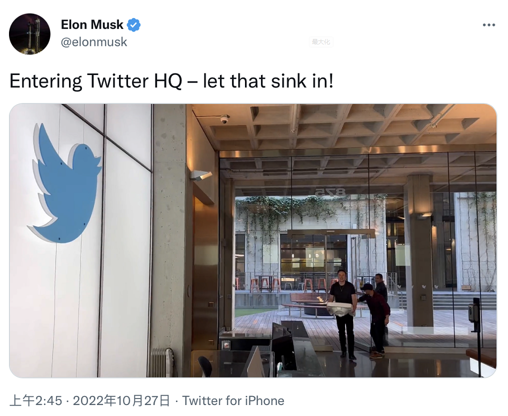 【环球网报道】据彭博社报道,美国亿万富翁埃隆·马斯克当地时间26日走进了推特公司的旧金山总部,他还将自己在推特账号的公开自我介绍改为“推特老板”(Chief Twit)。