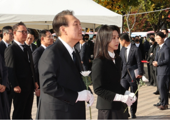 【环球网报道 记者 付嘉骏】据韩国纽西斯通讯社10月31日报道,韩国总统尹锡悦及其夫人金建希当日上午前往设置于首尔广场的哀悼场所,悼念梨泰院踩踏事故中的遇难者。