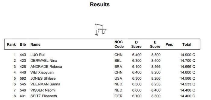 个人方面,巴西名将安德拉德排名全能资格赛榜首,两位中国选手欧钰珊和唐茜靖分列第6和第17,双双进入全能决赛。罗蕊和韦筱圆分别以第一和第四晋级高低杠决赛,欧钰珊排名平衡木资格赛第一。