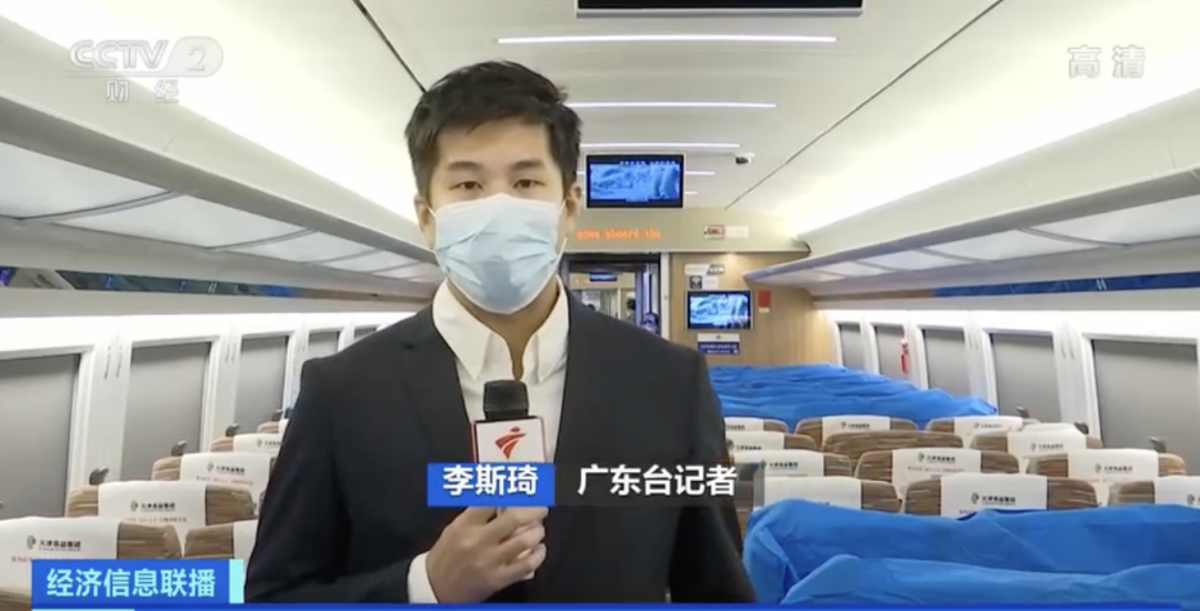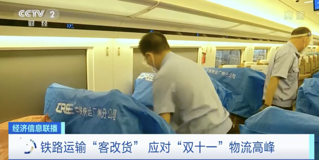 广东台记者 李斯琦: 这趟从广州南开往天津西的高铁列车,专门预留了一节7号车厢,用于运输大家“双十一”期间购买的商品,主要是化妆品和生活日用品。所有的包裹都通过消毒和安检后才能装车,包装上也贴有相关的标识。相比起传统的公路运输,高铁物流大概可以节省三分之二的时间成本。