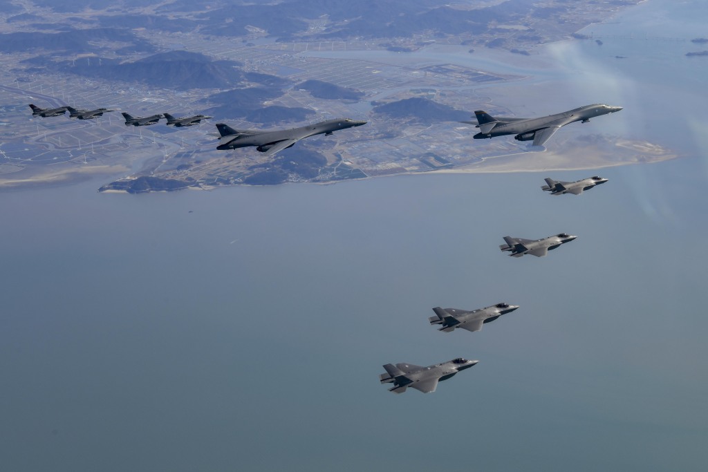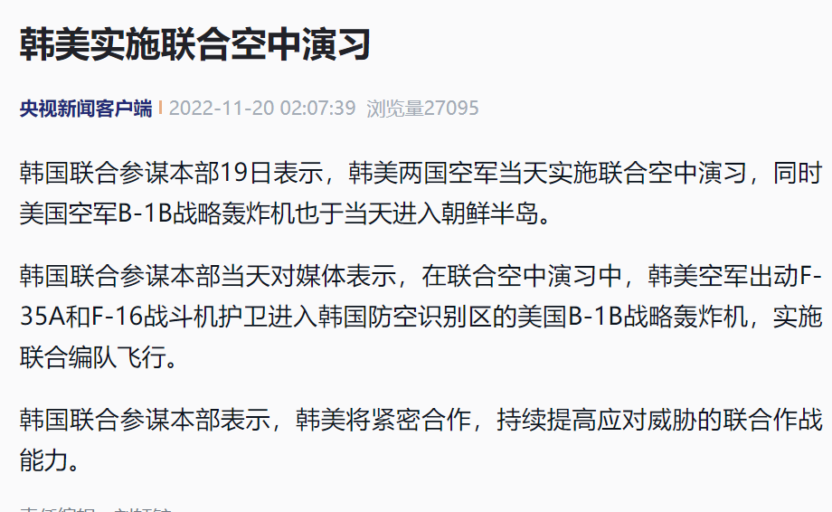 韩国联合参谋本部19日表示,韩美两国空军当天实施联合空中演习,同时美国空军B-1B战略轰炸机也于当天进入朝鲜半岛。