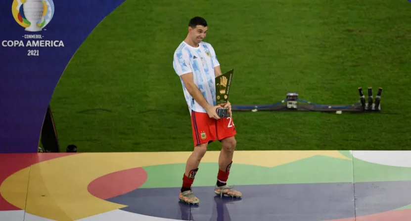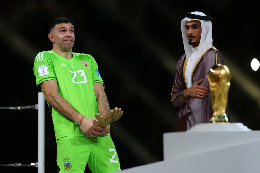 2022世界杯颁奖礼上,马丁内斯把金手套奖杯放在自己裆部比划庆祝 图源:外媒