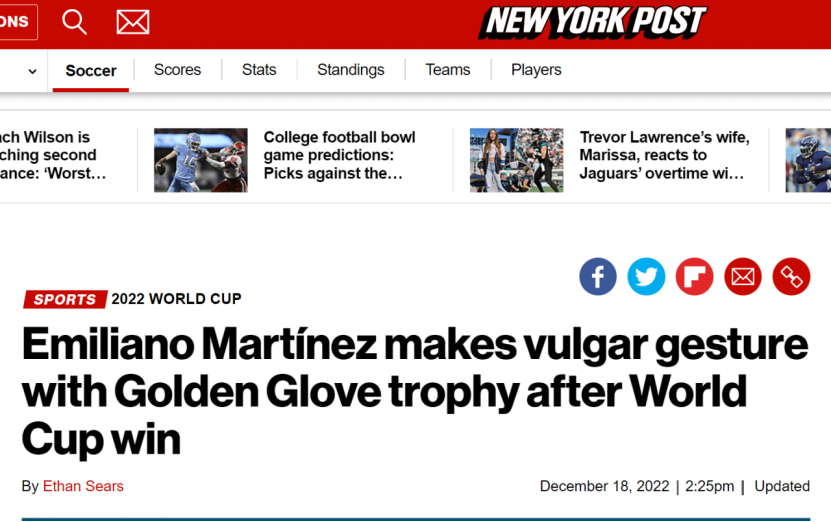 这已不是马丁内斯第一次做出这样的举动。据哥伦比亚“pulzo.com”新闻网站此前报道,2021年7月,马丁内斯帮助阿根廷夺得美洲杯冠军,荣膺美洲杯金手套奖,在当时的颁奖台上他也做出了类似的动作,也引发了同样的争议。