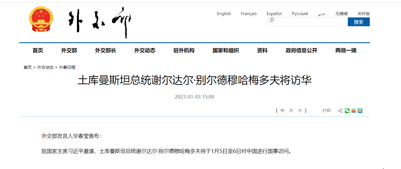 【环球时报综合报道】应中国国家主席习近平邀请,土库曼斯坦总统谢尔达尔·别尔德穆哈梅多夫于1月5日至6日对中国进行国事访问。此次访问也是别尔德穆哈梅多夫就任总统后首次访华。国际媒体注意到,2023年新年第一周,中国先后迎来菲律宾和土库曼斯坦领导人到访。这两国分别是中国周边东盟和中亚的重要国家,也是“一带一路”沿线的重要国家。5日,外交部发言人毛宁在记者会上表示,菲律宾总统马科斯访华期间,双方一致表示要深化中方“一带一路”倡议同菲律宾“多建好建”规划对接,还续签了共建“一带一路”合作谅解备忘录。多位中国外交关系研究学者5日接受《环球时报》采访时称,2023年是习近平主席提出“一带一路”倡议十周年。中国新年伊始就邀请“一带一路”沿线和周边两个重要国家的领导人来访,显示出中国视周边为发展繁荣之基,也表明面对国际格局变革动荡之际,中国真诚希望与各国,特别是“一带一路”沿线国家加强合作,携手拓展共同利益,为各国发展振兴注入新动力。