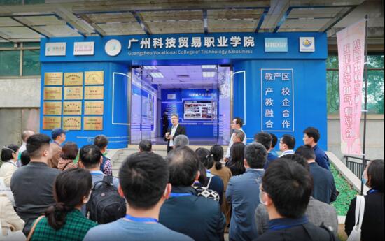 考察活动第二站:2月12日下午,参会嘉宾应邀来到广州市黄埔区光宝科技园区进行参观,光宝科技园区是广州科技贸易职业学院产教融合的重点实践基地,广州科技贸易职业学院副校长曾三军作为本次活动的发起者,简要介绍了“把学院建在产业园区、把专业建在产业链上”的建设理念和“入园建院、课岗融合”产业学院育人模式。