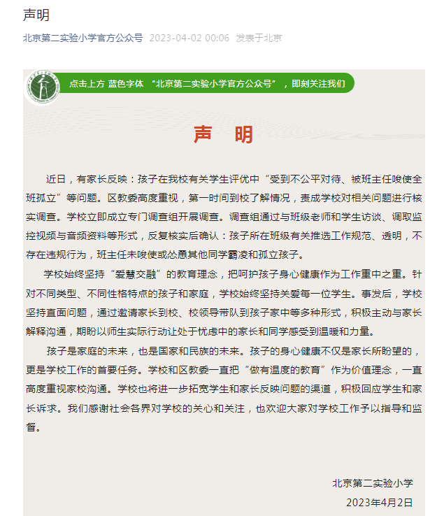 孩子是家庭的未来,也是国家和民族的未来。孩子的身心健康不仅是家长所盼望的,更是学校工作的首要任务。学校和区教委一直把“做有温度的教育”作为价值理念,一直高度重视家校沟通。学校也将进一步拓宽学生和家长反映问题的渠道,积极回应学生和家长诉求。我们感谢社会各界对学校的关心和关注,也欢迎大家对学校工作予以指导和监督。