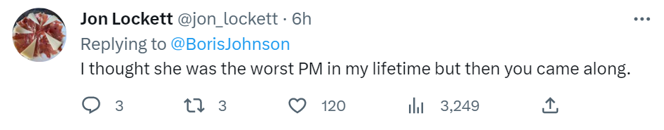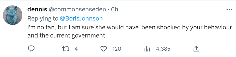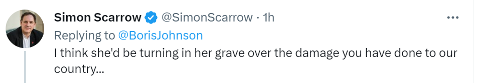 有网友回复约翰逊称,“我想她会因为你对我们国家造成的伤害,而在坟墓里翻来覆去。”“我本以为她是我这辈子见过的最差劲的首相,但后来你出现了。”“我不是(她的)粉丝,但我确定她会被你的行为和现任政府(的行为)所震惊的。”↓