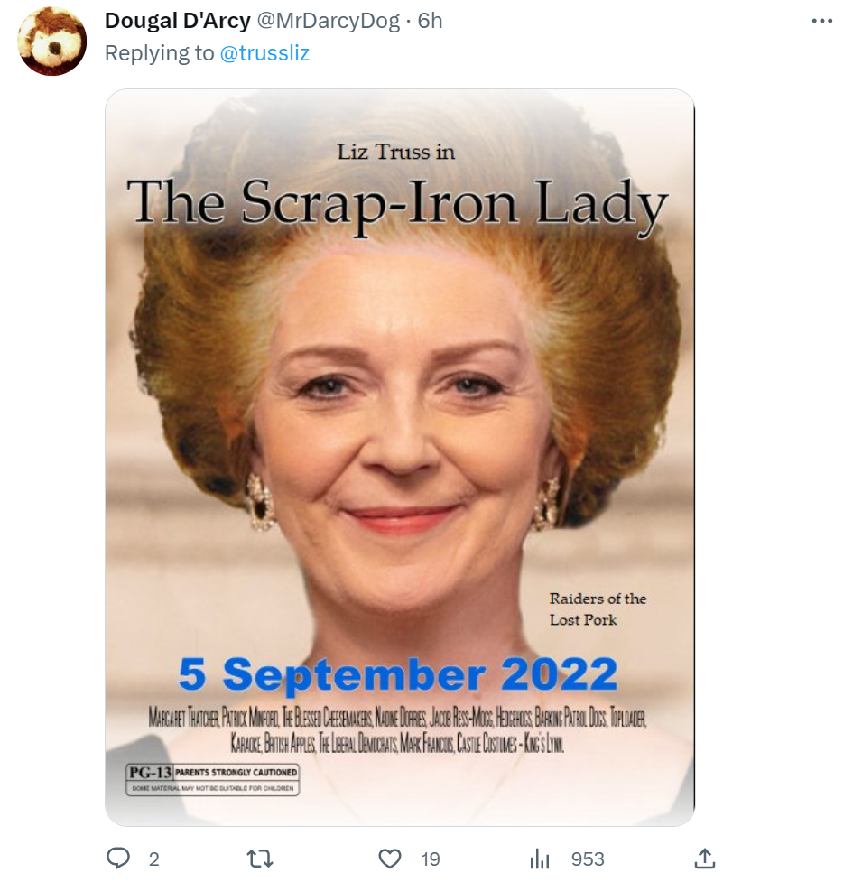 还有网友为特拉斯专门制作了一幅海报,上面文字写着“废铁娘子特拉斯”。↓