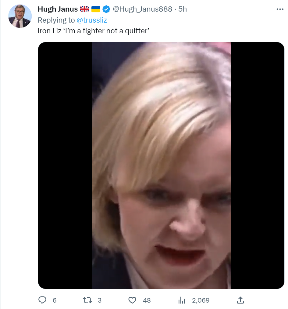 至于特拉斯,其在任职英国外交大臣期间就曾多次疑似效仿“铁娘子”撒切尔夫人。在其8日推文下方,不少网友提及这一点。有人晒出特拉斯此前在任英国首相时的视频,称“钢铁般的利兹(特拉斯),(曾说)‘我是战士,而不是懦夫’”,随后视频为她宣布辞任英国首相一职的画面,她当时又说“我辞职了”。↓
