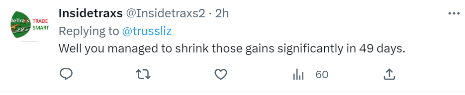也有网友仍未忘记特拉斯“英国史上‘最短命’首相”这一头衔,讽刺说“好吧,你在49天(特拉斯实际首相任期仅45天)里就明显缩减了这些成果。”↓