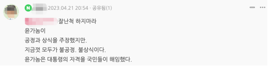“别装光鲜了,尹锡悦这家伙,虽然主张公正和常识,但到现在为止做出的全是不公平、反常识的言行。国民已经罢免了这家伙的总统资格。”↓