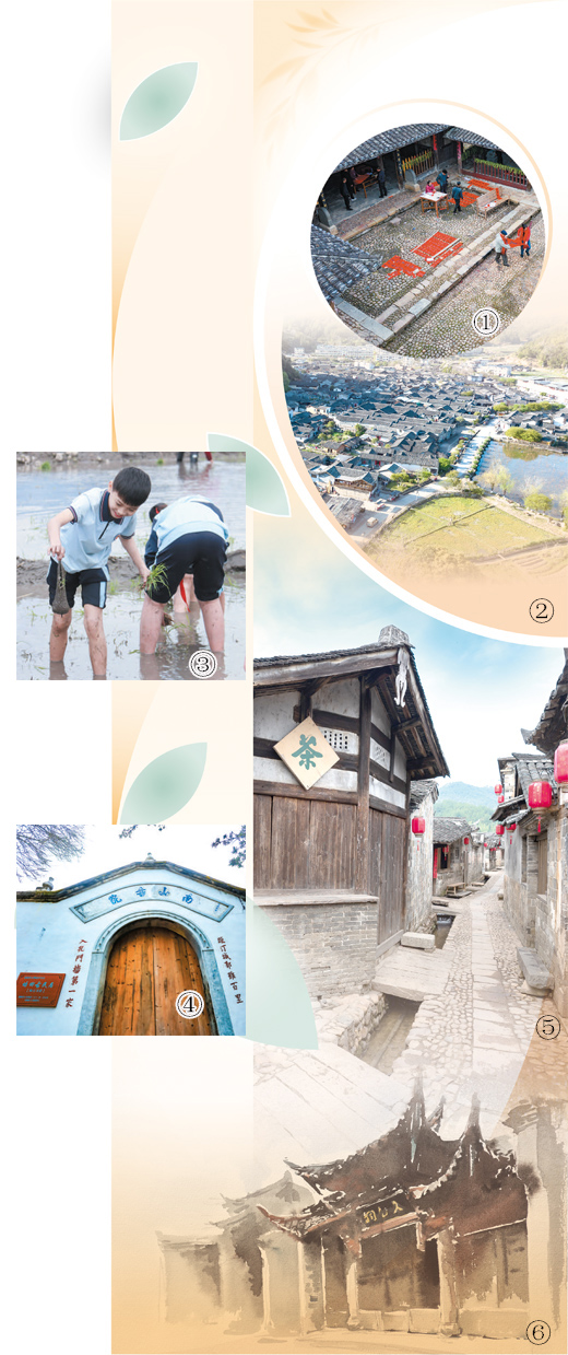 图③:在培田村的春耕节活动中,学生在稻田里体验插秧。