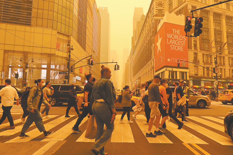 “橙色已成为这个国家的主色调”,加拿大发行量最大的报纸《多伦多星报》7日写道。当天渥太华、多伦多、蒙特利尔等大城市都笼罩在橙色雾霾中。同天,美国国家气象局在推特上发布了一段延时视频,显示北美最大城市纽约的天际线消失在厚厚的“橙色烟雾面纱”背后。随后,各种令人触目惊心的类似画面和视频充斥了网络平台和媒体头条。据美联社、加通社等媒体报道,一些北美航班旅客表示,他们甚至在飞机上闻到刺鼻的烟味,两国许多航班因山火被迫延误和停飞,人们不得不翻出疫情期间用剩的口罩,一些在白天举行的棒球比赛,击球手无法看清对方投手的来球,女演员科默以“污染导致呼吸问题”为由取消日场百老汇演出,著名的“芝麻街”敦促父母把孩子们留在室内,谷歌公司已经要求其在大西洋沿岸的员工居家工作。