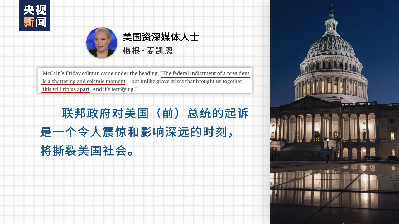 美国资深媒体人士梅根·麦凯恩近日发文直言,“联邦政府对美国(前)总统的起诉是一个令人震惊和影响深远的时刻,将撕裂美国社会。”