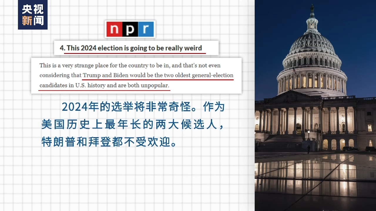 此外,美国全国公共广播电台网站日前还表示,备受关注的特朗普刑事案为2024年美国总统选举增添了不确定性。文章写道,“2024年的选举将非常奇怪。作为美国历史上最年长的两大候选人,特朗普和拜登都不受欢迎。”