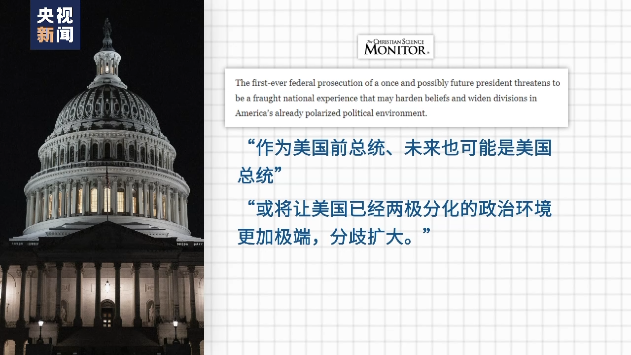 美国《基督教科学箴言报》日前发表文章指出,“作为美国前总统、未来也可能是美国总统”,特朗普遭联邦刑事指控或将“让美国已经两极分化的政治环境更加极端,分歧扩大。”