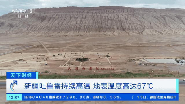 在吐鲁番市火焰山景区,滚滚热浪扑面而来,景区内,电子温度计显示地表温度高达67℃,特殊的极热体验,吸引众多游客前来“打卡”。