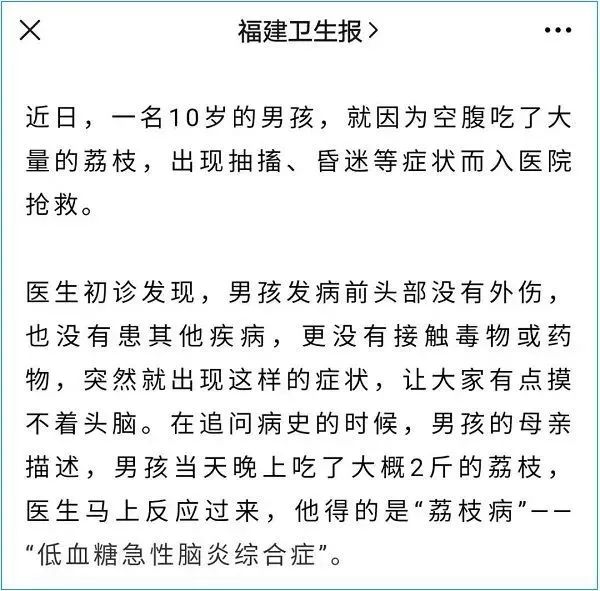 湖南长沙第四医院全科医学科主任沙莎仔细询问得知,原来最近大量新鲜荔枝上市,她前一天晚上在小区楼下买了3斤新鲜荔枝,一晚上就吃光了。直到第二天上班,她也没有食用其他食物,这才导致她患上了“荔枝病”。