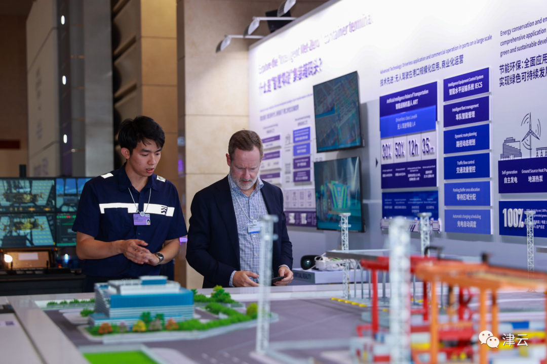 梅江会展中心二楼平台,天津港展示区吸引来往嘉宾驻足。天津港第二集装箱码头员工赵艺焜正在讲解,“开幕半天时间,已经有四五十拨的参观者,大家都比较关心天津港自动化的港口设备和清洁能源的使用方面,自动化方面实现了司机全坐在办公室里面远程操控;绿色能源方面,我们有零碳码头,能源全都是绿色能源。”