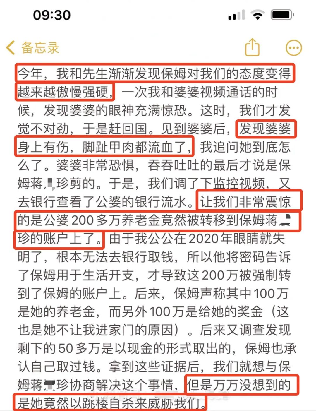 7月2日,自称老人儿媳的沈女士用该账号发文表示,因为和丈夫长期在国外工作,对于保姆蒋某珍很信任,尤其是疫情这几年,但没想到她会做出这些事。回国后,她发现公婆身上有伤,脚指甲肉都在流血……通过调取监控视频、查看银行流水,发现公婆200多万元养老金被转移到保姆蒋某珍账户。