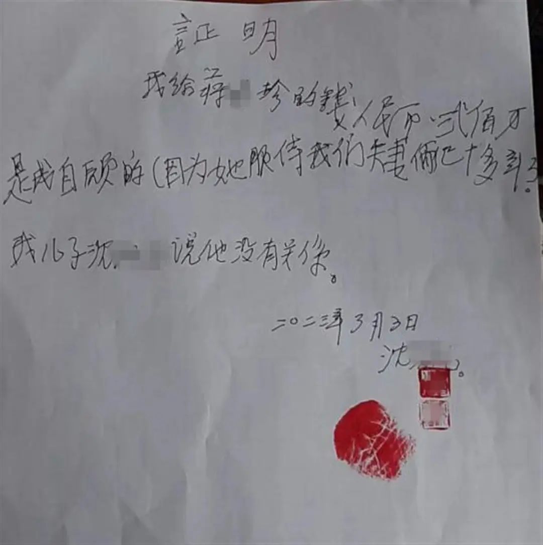 据极目新闻报道,7月1日,极目新闻记者走访老人所居住小区,有知情邻居称,200万元系卢阿婆丈夫沈老先生自愿给保姆的,还写了证明。对此,儿媳沈女士称是保姆蒋某珍逼着她公公写的。