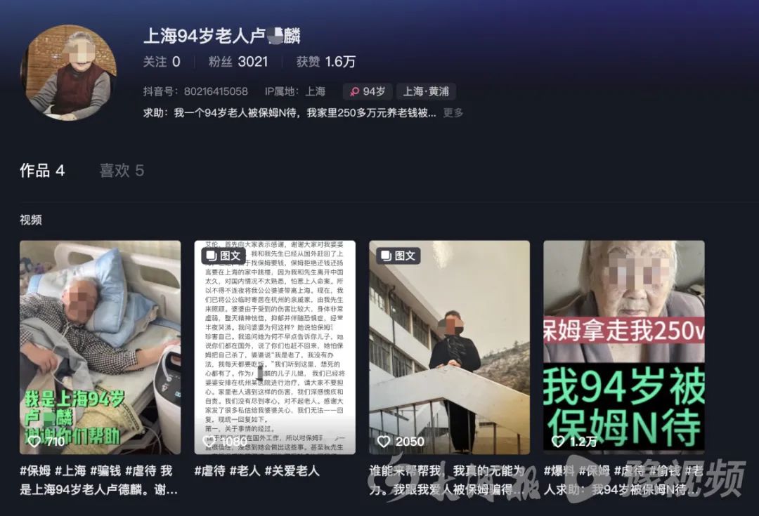6月29日,一个名为“上海94岁老人卢某麟”的社交账号发布一段视频,视频中老人向网友求助,她和失明的老伴惨遭保姆蒋某珍虐待,还被其分多次转走250万元养老钱。7月3日,大河报·豫视频《看见》记者致电辖区派出所得知,老人的家属已经赶到上海,正在沟通此事。