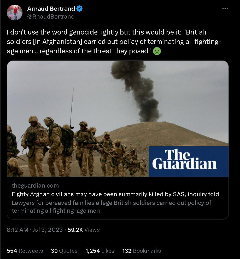 这也是为何外国网络大V、法国企业家阿诺德·贝特朗认为,英军在阿富汗的做法是名副其实的“种族灭绝”。