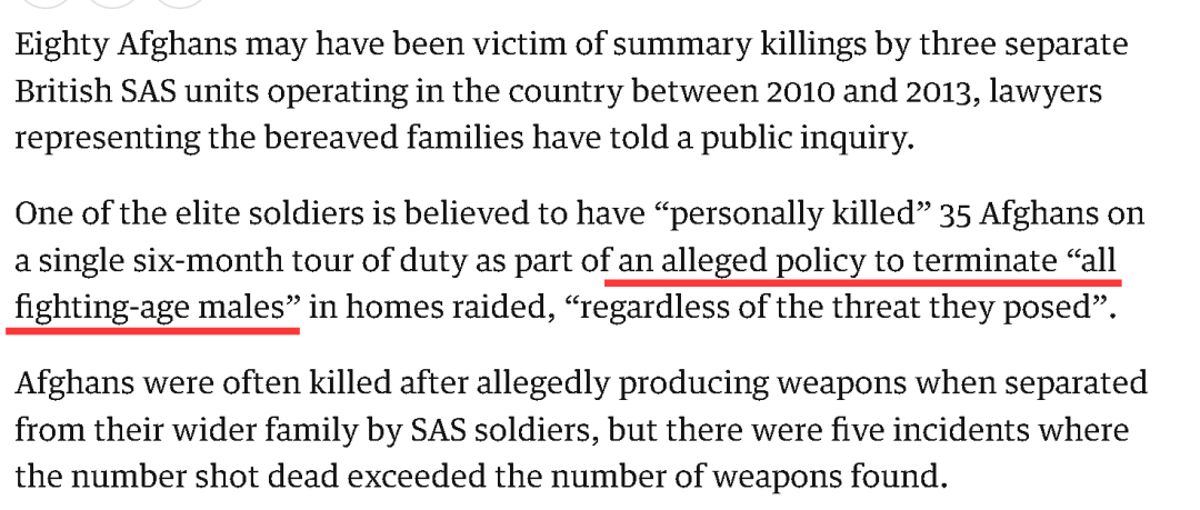 其中最为骇人听闻的情节是,该部队中的一名精英士兵,居然一个人就在短短6个月里在阿富汗各处的村庄里屠杀了35人,这是因为英军内部被指存在一项政策,要求英军士兵在搜寻阿富汗塔利班战士时,要顺便“终结”所有在可参加战斗年龄段的阿富汗男性——不论这些人是否真的构成威胁。