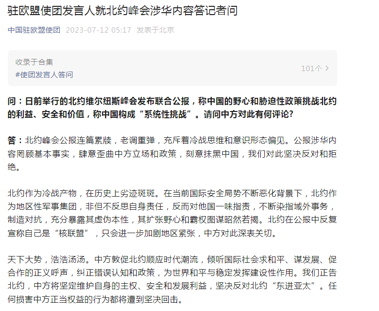 问:日前举行的北约维尔纽斯峰会发布联合公报,称中国的野心和胁迫性政策挑战北约的利益、安全和价值,称中国构成“系统性挑战”。请问中方对此有何评论?